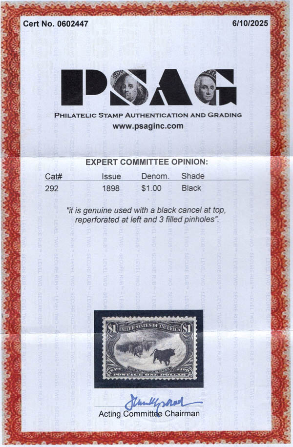 1898, $1 Trans-Miss. (Scott 292), extremely lightly canceled; reperfed at left and 3 filled pinholes, Fine to Very Fine appearing, with 2025 P.S.A.G. certificate. Scott $675.