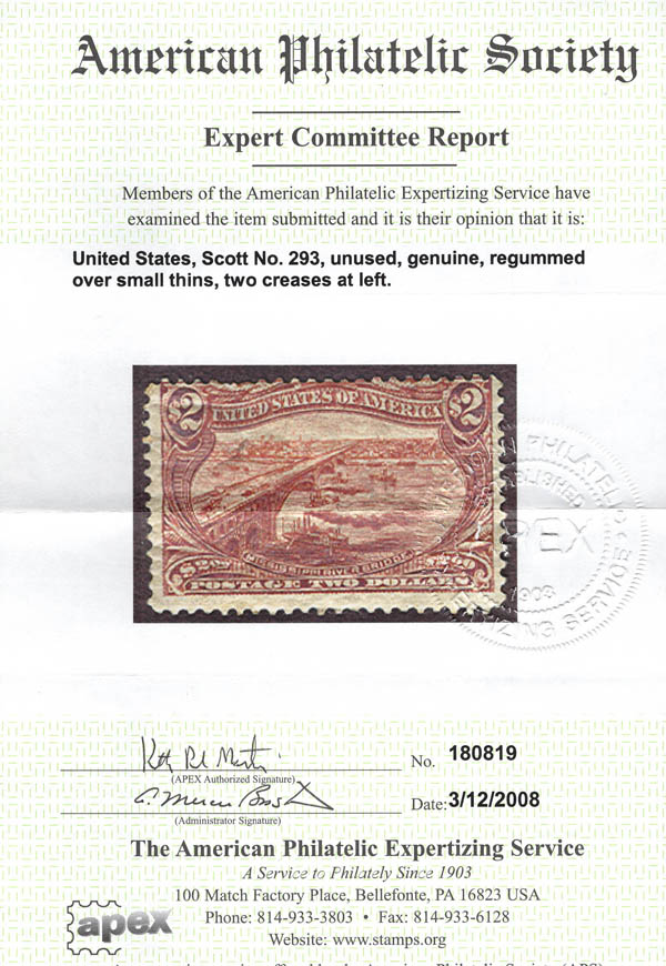 1898, $2 Trans-Miss. (Scott 293), regummed over small thins; two creases at left, Very Good centering, with 2008 A.P.S. certificate. Scott $950.