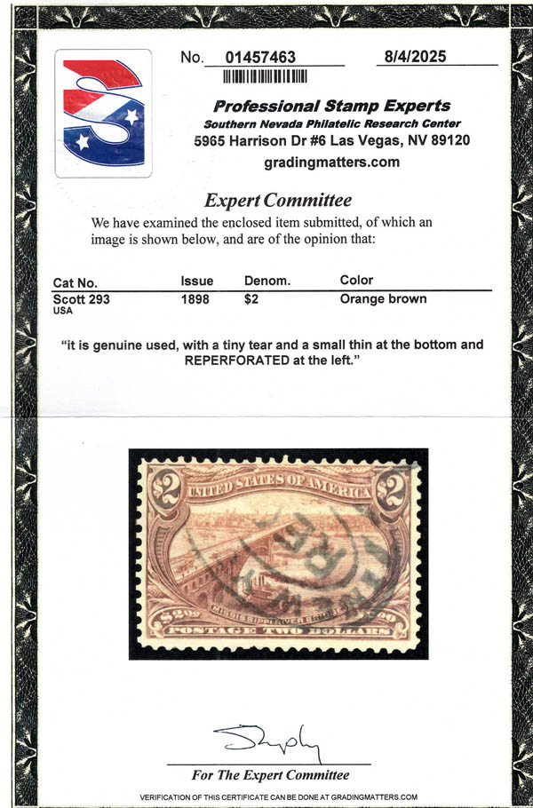 Lot 641 o 1898, $2 Trans-Miss. (Scott 293), lightly struck New York registry cancel; reperfed at left, a tiny tear and small thin at bottom, Fine appearance, with 2025 P.S.E. certificate. Scott $1,000. Estimate $200 - 300. |