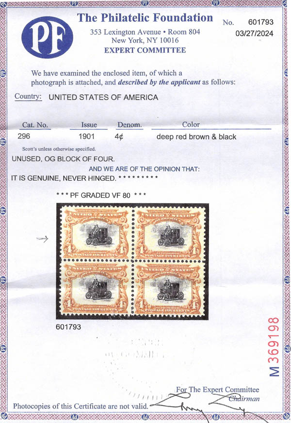 1901, 4¢ Pan-American (Scott 296), o.g., never hinged, Very Fine, with photocopy of 2024 P.F. certificate graded VF 80 for block, this being the top left stamp. Scott $170.