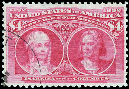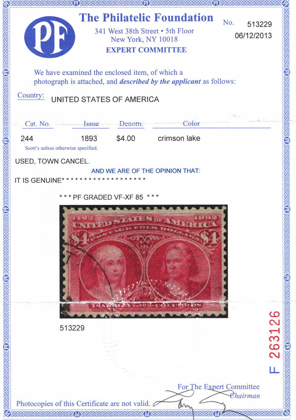 Lot 65 o 1893, $4 Columbian (Scott 244), radiant color and very well centered, with a neat light corner c.d.s., Very Fine to Extremely Fine, with 2013 P.F. certificate graded VF-XF 85. Scott $975. Scott Stamp Values $1,500. SMQ $1,425. Estimate $1,000 - 1,500. |