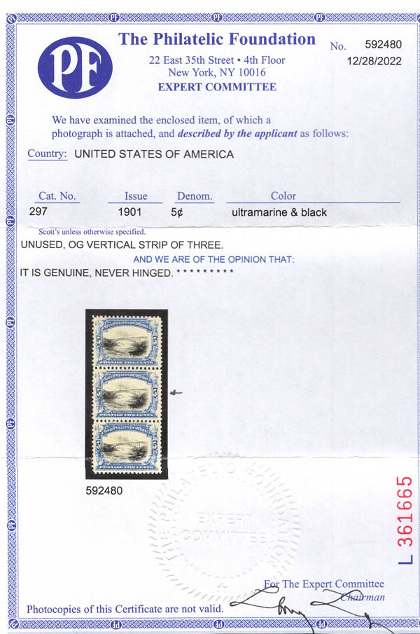 1901, 5¢ Pan-American (Scott 297), o.g., never hinged, Very Fine, with photocopy of 2022 P.F. certificate for strip of 3 this being the middle stamp. Scott $180.
