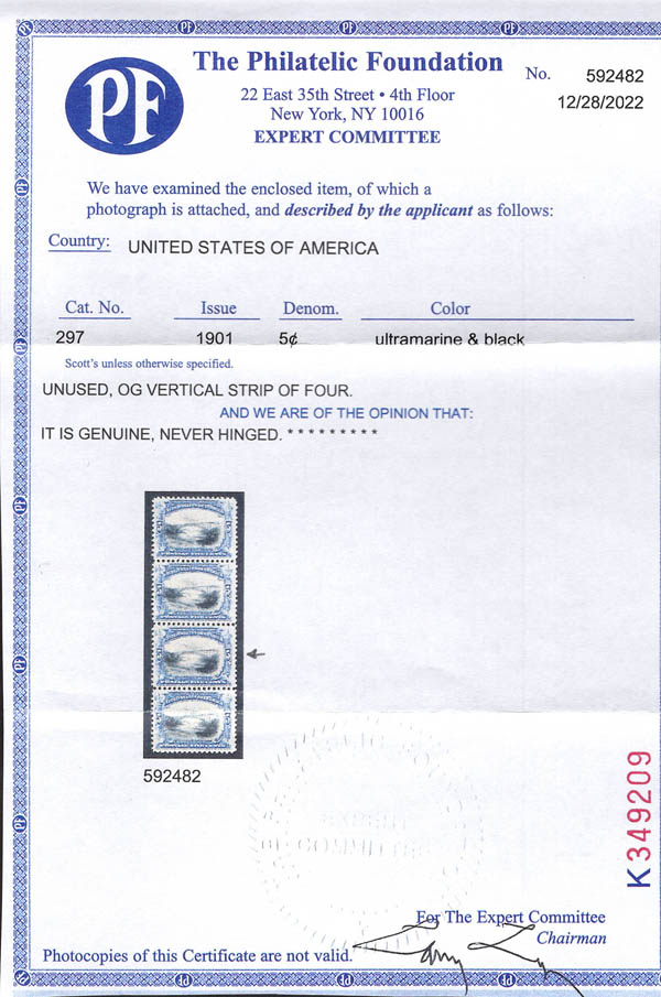 1901, 5¢ Pan-American (Scott 297), o.g., never hinged, Very Fine or better, with photocopy of 2022 P.F. certificate for strip of 4, this being the third stamp. Scott $180.