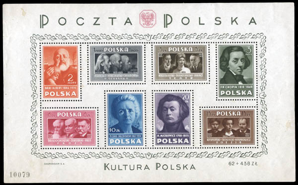 Lot 67![]() ![]() Poland, 1947-2013, collection of souvenir sheets and complete sheets. 19 total, with some occasional duplication, neatly arranged and identified on hingeless stock pages, including some better (such as # 412a, cat. $190), all in excellent Post Office fresh condition, o.g., never hinged, Very Fine, excellent topical interest. Scott $1,860. Estimate $350 - 500. |