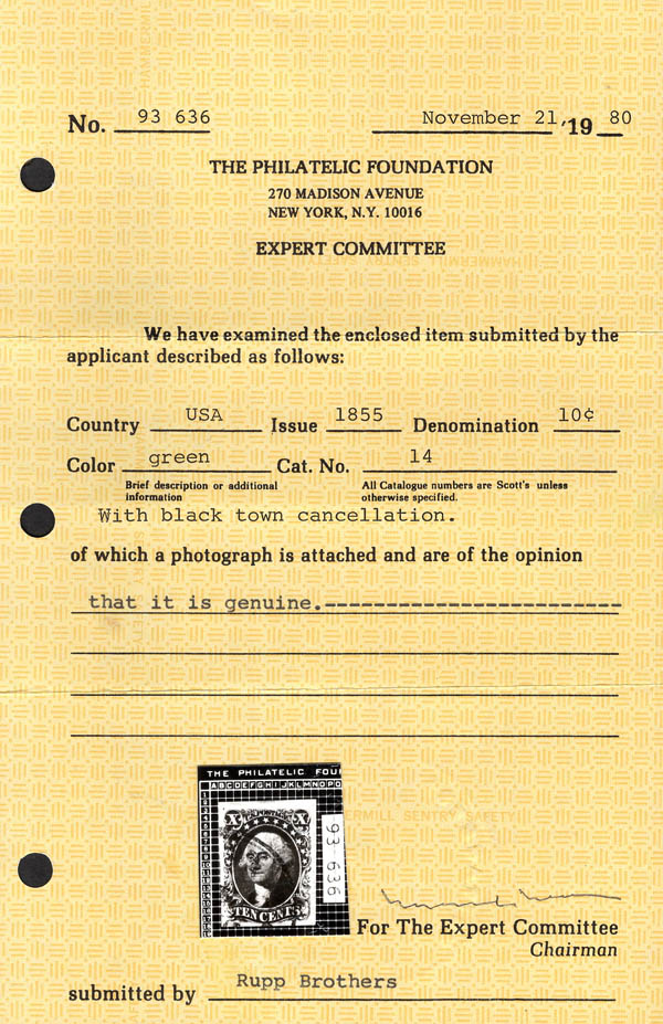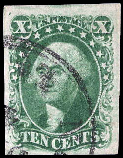 1855, 10¢ Washington, green, type II (Scott 14), black town cancellation, Extremely Fine, with 1980 P.F. certificate. Scott $145.