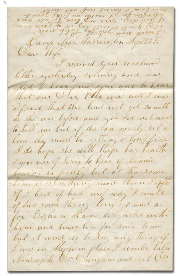 Lot 72![]() 1863, soldier's letter from a "Camp Near Warrington, Va.", a lengthy letter explaining what the soldier did during the day, in a cover addressed to the soldier's wife and neatly postmarked Washington, D.C. Roughly opened at left, Fine, nice historic content. Estimate $120 - 150. |