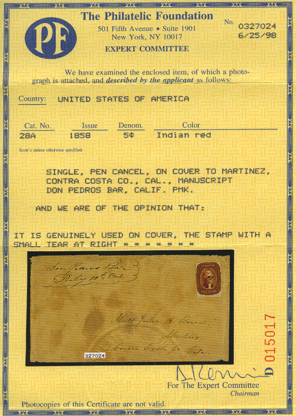 Lot 72![]() 1858, 5¢ Jefferson, Indian red, type I (Scott 28A), full margins, used on piece with Martinez, Ca. pen cancel; the stamp with a small tear at right, otherwise Fine, with 1999 P.F. certificate for the full cover from which this originated, an attractive certified example of this very scarce shade. Scott $1,650. Estimate $350 - 500. |