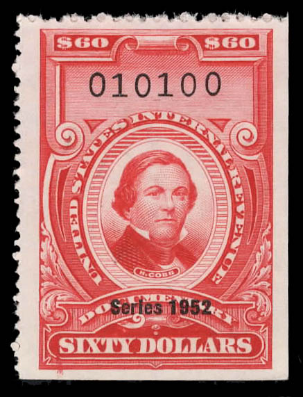 Documentary, 1952, $60 carmine (Scott R613), without gum as issued, Very Fine.