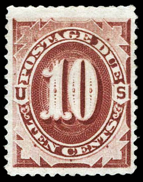Postage Due, 1884, 10¢ red brown (Scott J19), well centered for this issue and with rich bright color, o.g., hinge remnant, Very Fine. Scott $550.