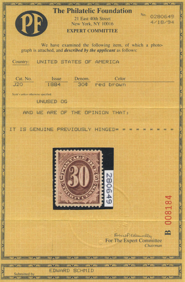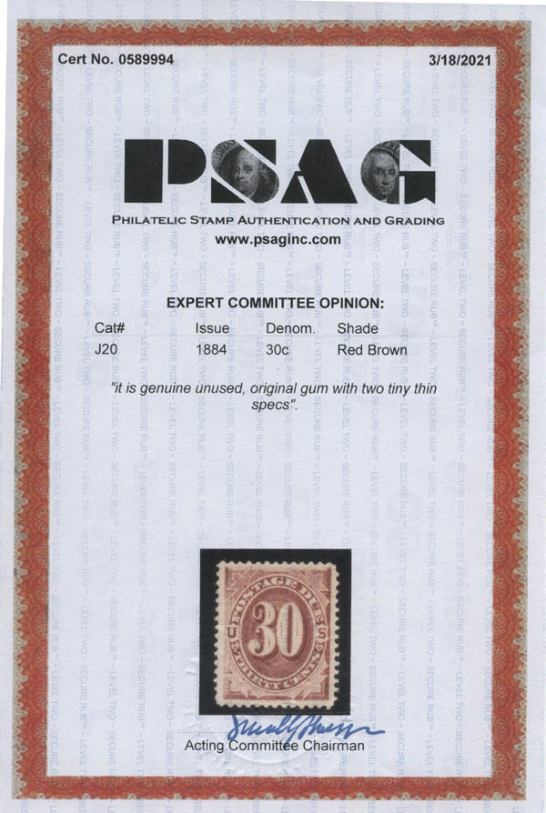 Lot 728![]() Postage Due, 1884, 30¢ red brown (Scott J20), near perfect centering and excellent color, o.g., hinged, two tiny thin specks, otherwise Extremely Fine, with 2021 P.S.A.G. certificate, plus a clear 1994 P.F. certificate that does not mention any faults. Scott $225. Estimate $80 - 120. |