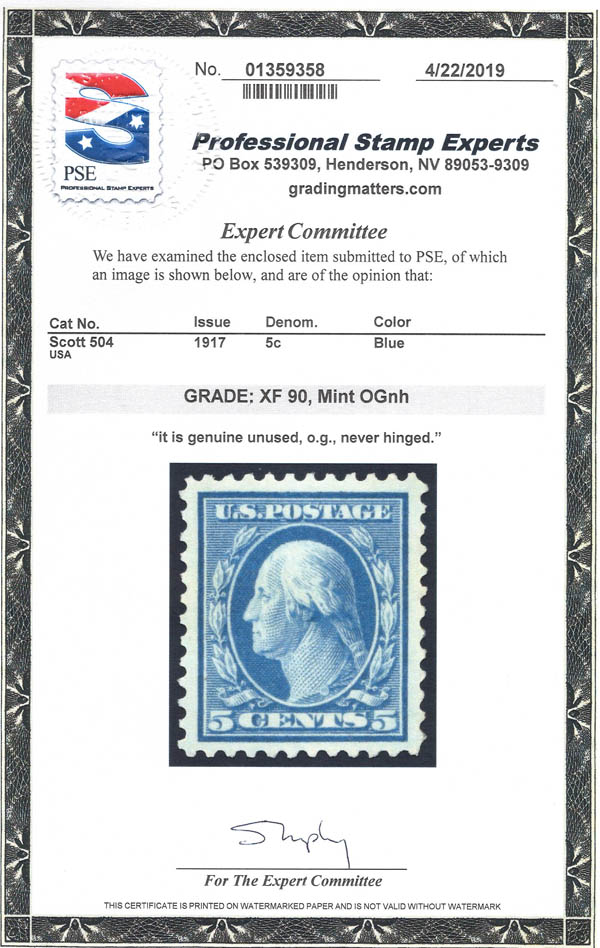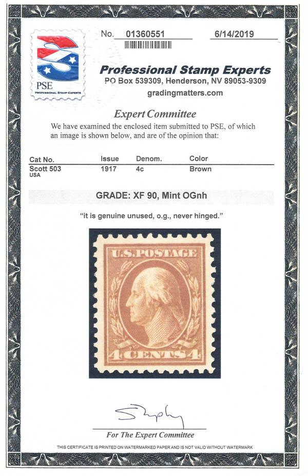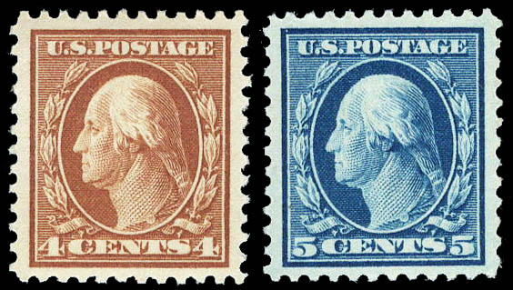 Lot 73![]() ![]() 1917, 4¢ Washington, brown, and 5¢ Washington, blue, perf. 11 (Scott 503, 504), a lovely pair of stamps, o.g., never hinged, Extremely Fine, with 2019 P.S.E. certificates graded XF 90. Scott $36. SMQ $110. Estimate $75 - 100. |