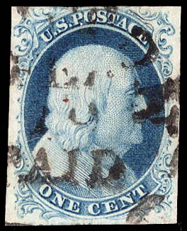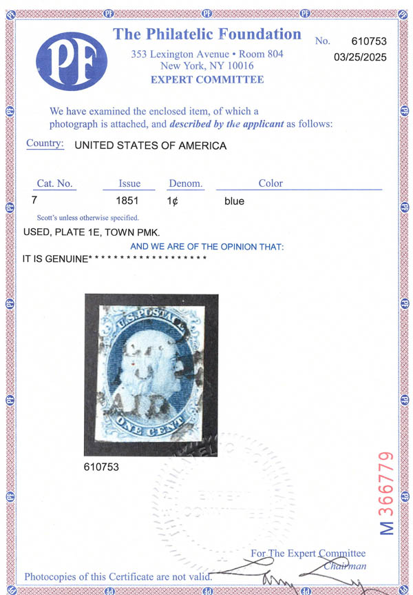 Lot 74 o 1851, 1¢ Franklin, blue, type II (Scott 7), plate 1E, mostly large margins (just touching at the top), town postmark and nicely struck PAID cancel, Fine to Very Fine, with 2025 P.F. certificate. Scott $140. Estimate $60 - 80. |
