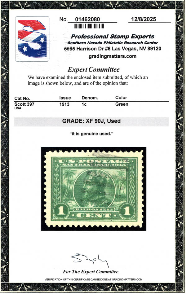 Lot 758 o 1913, 1¢ Panama-Pacific, perf. 12 (Scott 397), essentially perfect centering amid lavish margins, light cancel, Extremely Fine, with 2025 P.S.E. certificate graded XF 90J. SMQ $135. Estimate $80 - 120. |