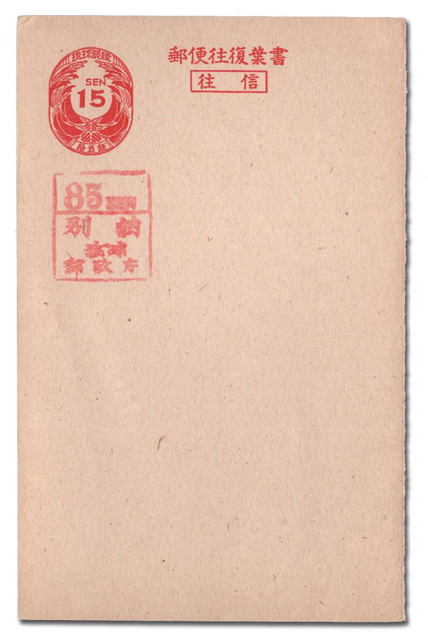 Ryukyus, Paid Reply Postal Card, 1951, 85s handstamped surcharge type "d" on 15s vermilion on tan, message card (Scott UY4j), pristine mint, Very Fine.