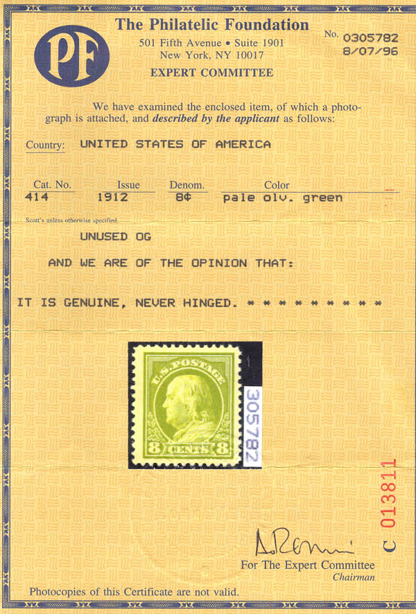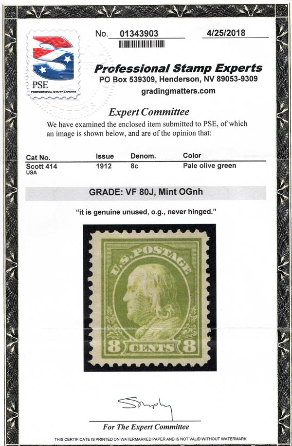 Lot 783![]() ![]() 1912, 8¢ Franklin, pale olive green, S.L. watermark, perf. 12 (Scott 414), o.g., never hinged, Very Fine, with 1996 P.F. and 2018 P.S.E. certificates, the latter graded VF 80J. Scott $100. SMQ $120. Estimate $80 - 120. |