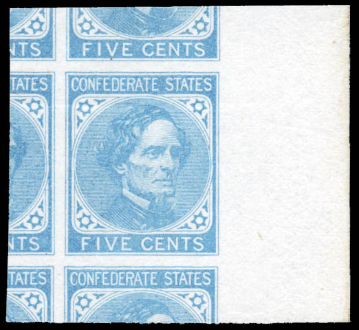 Confederacy, 1862, 5¢ light blue, De La Rue printing (Scott 6), a magnificent right margin single, showing parts of 5 neighboring stamps, usual streaky o.g., never hinged, Superb.
