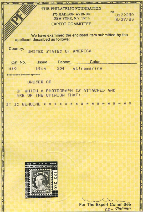 Lot 790![]() ![]() 1914, 20¢ Franklin, ultramarine, S.L. watermark, perf. 12 (Scott 419), exceptionally well centered, with brilliant fresh color, o.g., never hinged, Very Fine to Extremely Fine, with 1983 and 2024 P.F. certificates, the latter graded VF-XF 85. Scott $400. SMQ $525. Scott Stamp Values $525. Estimate $350 - 500. |