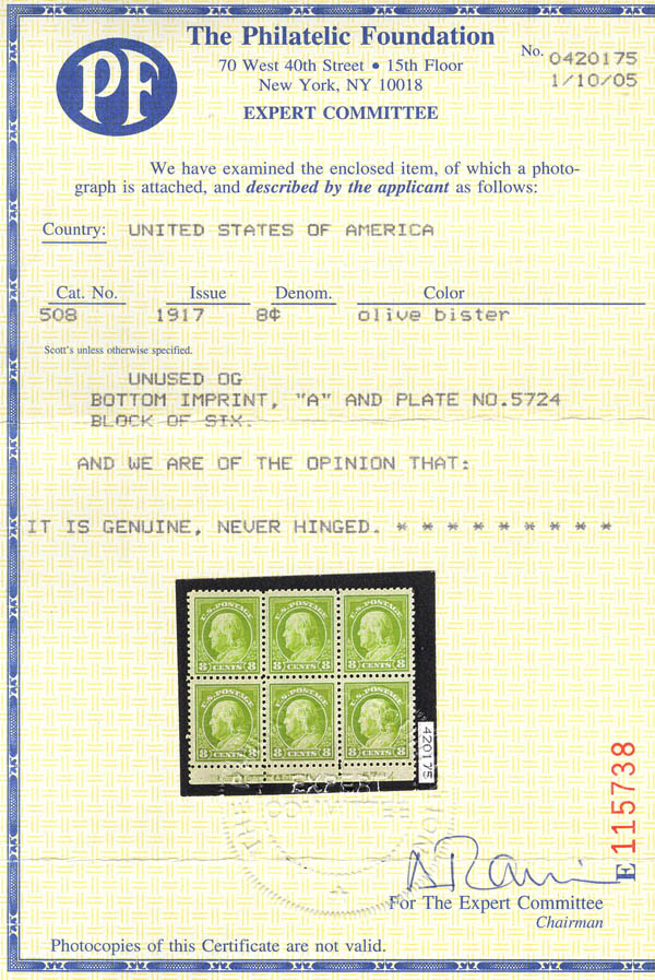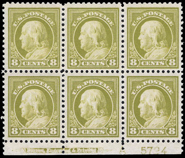 Lot 798![]() ![]() ![]() 1914, 8¢ Franklin, pale olive green, S.L. watermark, perf. 10 (Scott 431), plate block of 6, fresh and very well centered, o.g., never hinged, Very Fine, with 2005 P.F. certificate. Scott $850. Estimate $500 - 750. |