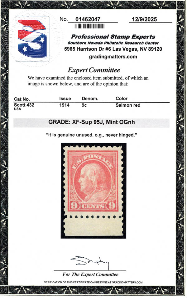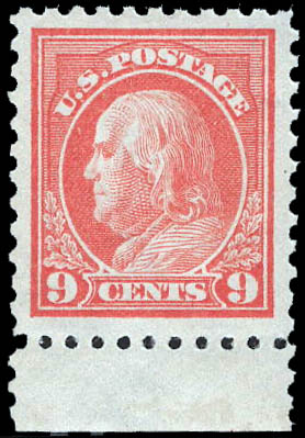 Lot 799![]() ![]() 1914, 9¢ Franklin, salmon red, S.L. watermark, perf. 10 (Scott 432), sheet margin single, incredibly well centered within oversized margins, an eye-popping beauty, o.g., never hinged, Extremely Fine to Superb, with 2025 P.S.E. certificate graded XF-SUP 95J. Scott $80. SMQ $1,150. Estimate $800 - 1,200. |