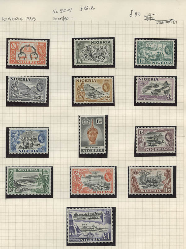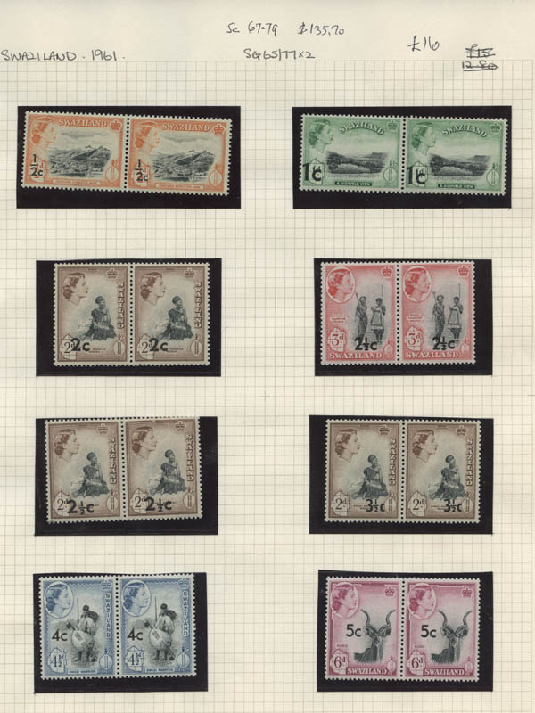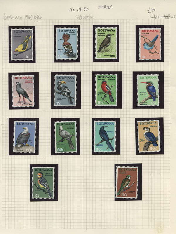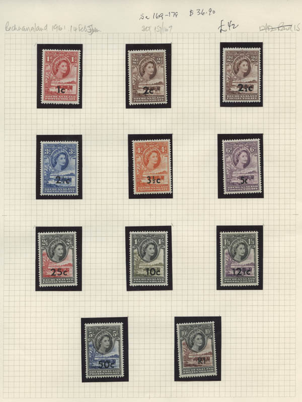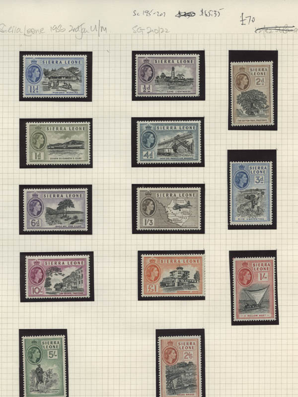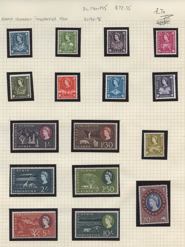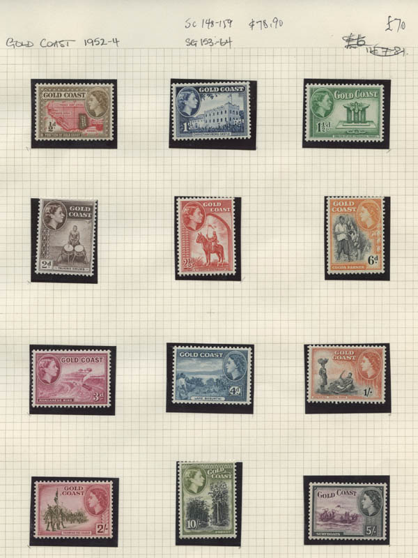 Lot 8![]() ![]() British Africa, 1953-67, Queen Elizabeth II, 7 early definitive sets complete, including Bechuanaland, Botswana, Gold Coast, Kenya, Uganda & Tanganyika, Nigeria, Sierra Leone and Swaziland. Neatly identified and in mounts on pages, o.g., never hinged, Fine to Very Fine. Scott $535. SG £388 ($480). Estimate $100 - 150. |
