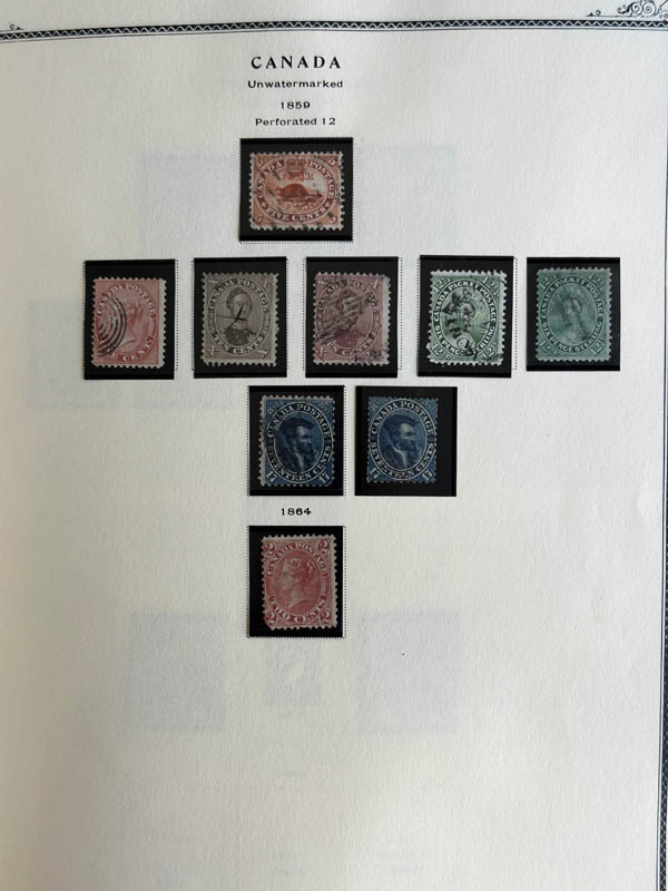 Lot 8![]() Canada, 1859-1999, an extensive mint and used collection, hinged or in mounts in one bulging Scott album. Includes a nice representation of Queen Victoria issues (catalog value approximately $3300, mostly used), the 4 Kings nearly complete (catalog value approximately $1000, mainly used), Queen Elizabeth II nearly complete (catalog value approximately $700, mainly mint with occasional used), and scattered back-of-the-book. No rarities, but a nice foundation to build upon, generally Fine to Very Fine. Shipping weight 8 lbs / 3.6 kilos. Scott approximately $5,000. Estimate $600 - 800. |