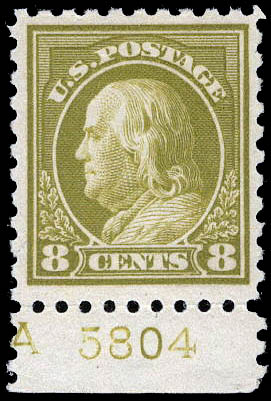 1916, 8¢ Franklin, olive green, unwatermarked, perf. 10 (Scott 470), plate number single, o.g., never hinged, Very Fine. Scott $165.
