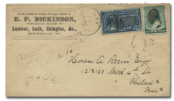 Lot 829![]() Special Delivery, 1885, 10¢ blue (Scott E1), used with 2¢ Bank Note on a Nov. 13, 1887 cover from a dealer in "lumber, lath, shingles etc." in Coatesville, Pa., addressed to Philadelphia, with purple handstamp "Returned by Messenger / As Undeliverable", with Nov 16 backstamp, Fine to Very Fine, the handstamp is very scarce. Scott $225+. Estimate $120 - 150. |