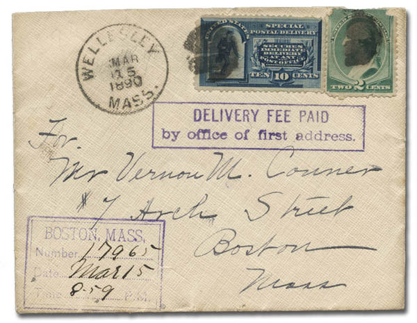 Lot 831![]() Special Delivery, 1888, 10¢ blue (Scott E2), used with a (slightly faulty) 2¢ Bank Note on an 1890 cover from Wellesley, Mass. to Boston, with a beautiful strike in purple of boxed "DELIVERY FEE PAID by office of first address", and with Boston backstamp, Very Fine and choice. Scott $135. Estimate $60 - 80. |