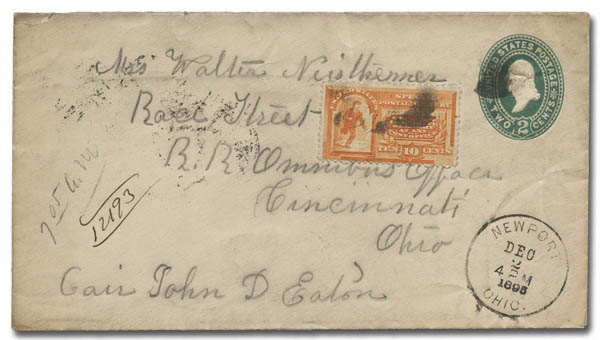 Lot 832![]() Special Delivery, 1893, 10¢ orange (Scott E3), used in 1895 on a 2¢ Plimpton entire (U311) from Newport, Ohio to Cincinnati, with 3 backstamps. Back flap torn, Fine to Very Fine overall. Scott $200. Estimate $60 - 80. |