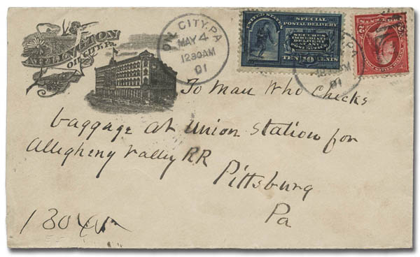 Lot 834![]() Special Delivery, 1895, 10¢ blue (Scott E5), used with 2¢ postage on a 1901 advertising cover from Oil City, Pa. to Pittsburg, with Pittsburg backstamp. The cover is addressed "to man who checks baggage at Union Station for Allegheny Valley RR" - which certainly rates as a marvelously unique address, Very Fine, a most remarkable cover. Estimate $120 - 150. |