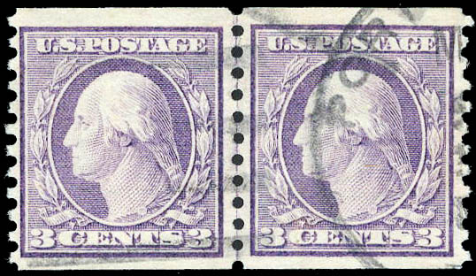 Lot 835 o 1917, 3¢ Washington, violet, type I, unwatermarked, rotary press coil, perf. 10 vertically (Scott 493), line pair, left stamp has a face free cancel, Fine to Very Fine, with 2025 P.F. certificate graded F-VF 75. Scott $90. SMQ $85. Estimate $60 - 80. |