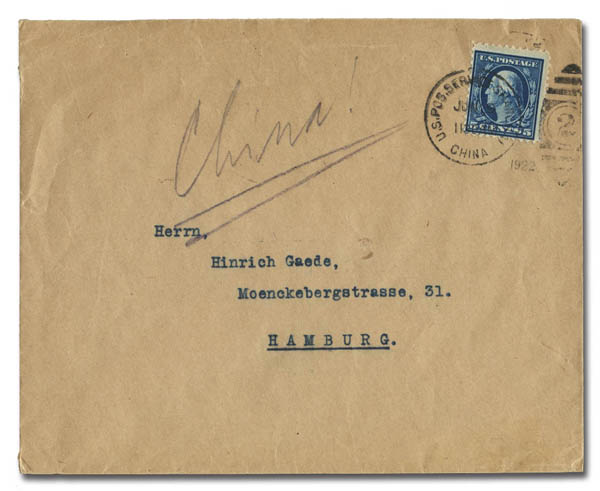 Offices in China, 1922 (Jun 19), cover from the U.S. Postal Service in Shanghai, China to Hamburg, Germany, 5¢ U.P.U. rate, no backstamp, Fine to Very Fine.