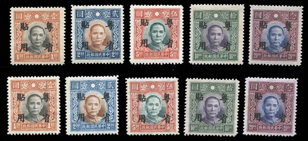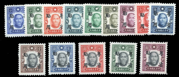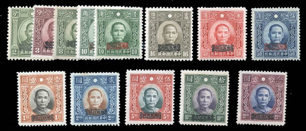 Lot 85![]() /![]() China: Japanese Occupation of Kwangtung, 1942, 2¢ to $20 overprints nearly complete (Scott 1N1-13, 1N23-25, 1N27-56), well centered, o.g., lightly hinged or never hinged, Very Fine. Scott $352. Estimate $120 - 150. |