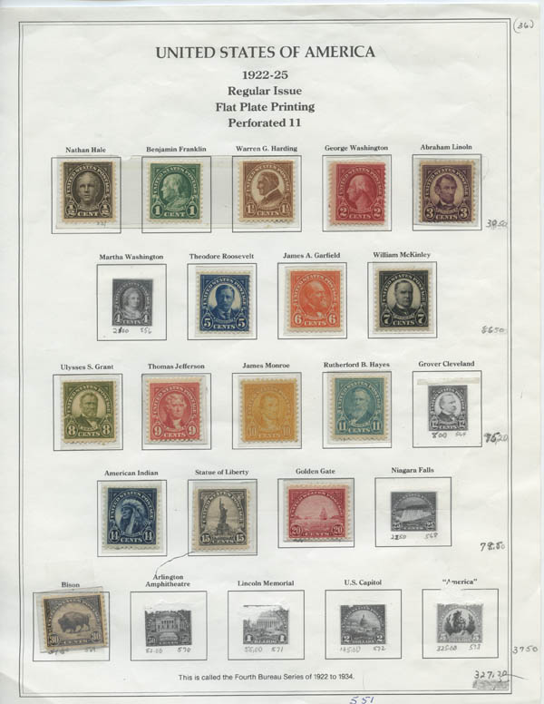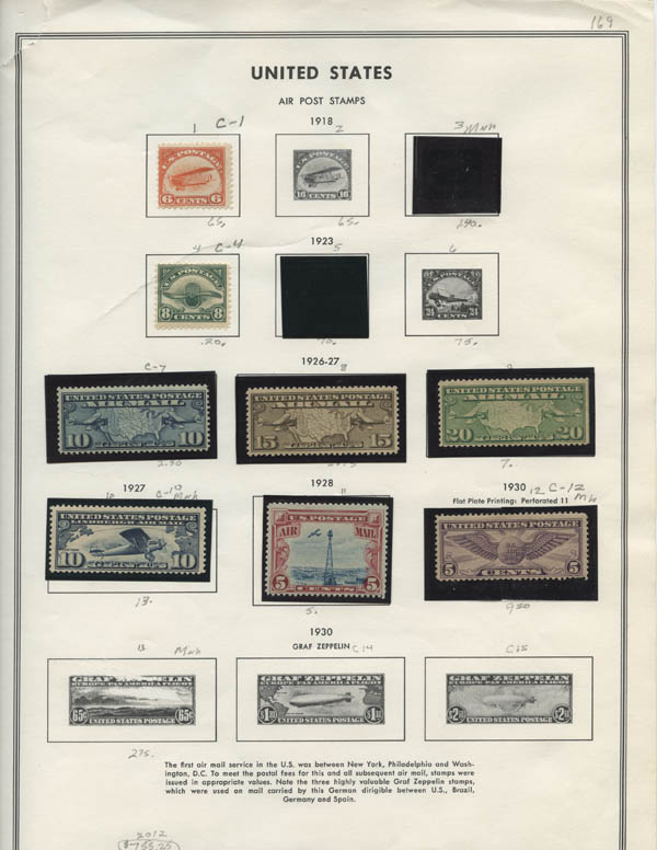 Lot 854 o 1862-1988, small beginner's collection of mint and used, in older mounts on album pages. Includes a smattering of early issues to about 1915, then some definitives, airmail, special delivery and other back-of-the-book, with the main value from 1918 on. Best item is a hinged C18. Usual mixed condition with some faults on early issues, F.-V.F. for the more modern. Scott approximately $600. Estimate $75 - 100. |