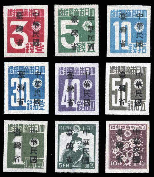 Lot 86 ( )China: Taiwan Province, 1945, "Republic of China, Taiwan Province" overprints on Japanese definitives, 3s to 10y complete (Scott 1-9), without gum as issued, Very Fine. Scott $127. Chan TP4-12. Estimate $60 - 80. |