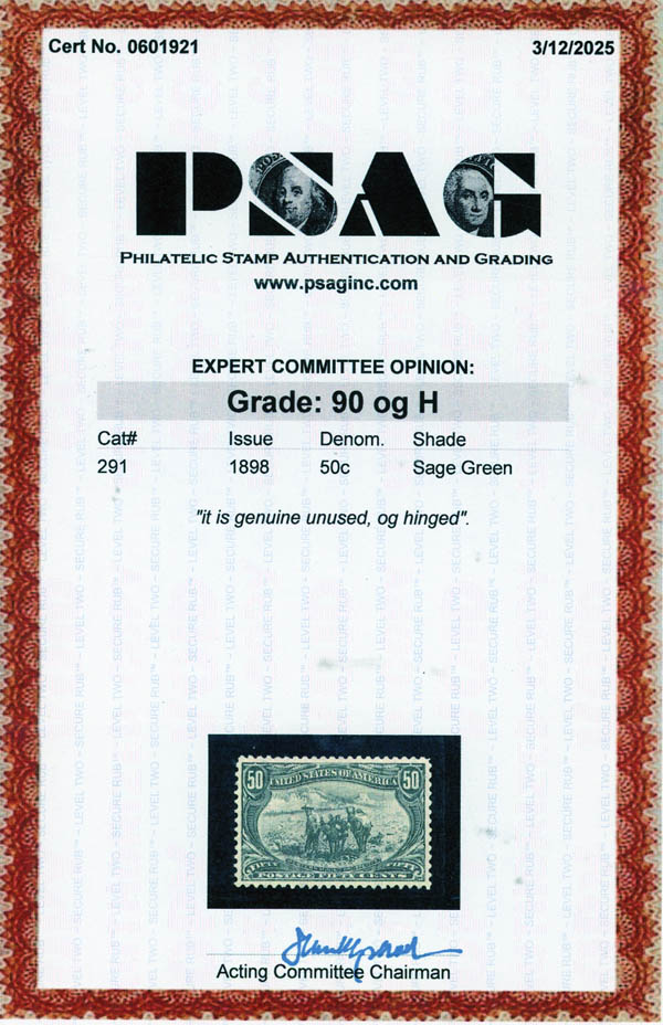 Lot 86![]() 1898, 50¢ Trans-Miss. (Scott 291), extraordinarily well centered, with rich luxurious color, o.g., hinged, Extremely Fine, with 2025 P.S.A.G. certificate graded XF 90. Scott $600. Scott Stamp Values $1,000. SMQ $1,050. Estimate $750 - 1,000. |