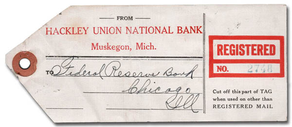 Lot 862![]() 1918, $5 Franklin, deep green & black (Scott 524), on a Hackley Union National Bank Muskegon, Michigan registry label with 3¢, two 30¢ and $1 stamps, Very Fine, a scarce and rarely seen official usage, The $5 Scott #524 catalogs $2500 on cover. Estimate $750 - 1,000. |