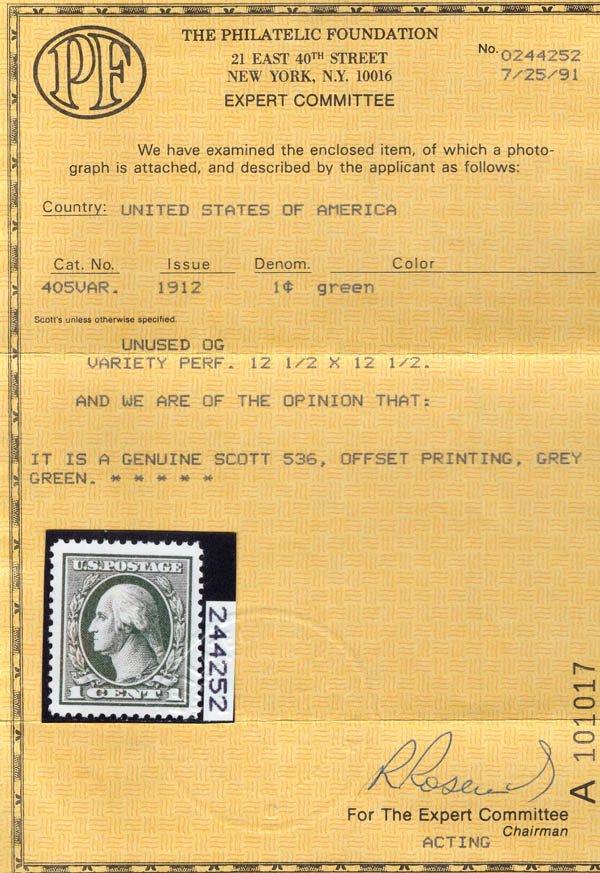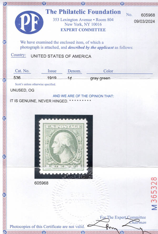 1919, 1¢ Washington, gray green, offset printing, perf. 12½ (Scott 536), o.g., never hinged, Extremely Fine, with 1991 and 2024 P.F. certificates. Scott $45.