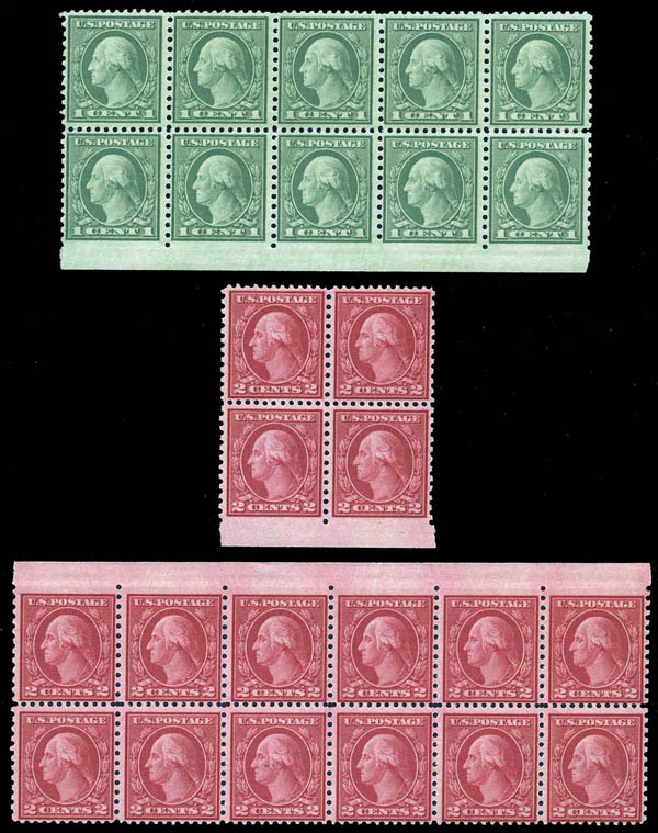 Lot 871![]() ![]() ![]() 1919, 1¢ Washington, green and 2¢ Washington, type II, carmine rose, rotary press coil waste, perf. 11 x 10 (Scott 538, 540 vars.), 1¢ block of 10, imperf at bottom; 2¢ block of 4, imperf at bottom; and 2¢ block of 12, imperf at top, o.g., never hinged, Fine to Very Fine. Scott $670 as normal. Estimate $200 - 300. |