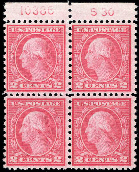 Lot 873![]() ![]() ![]() 1919, 2¢ Washington, type II, carmine rose, rotary press coil waste, perf. 11 x 10 (Scott 540), top plate block of 4 with S30 and a rare plate number, o.g., never hinged, Fine to Very Fine. Scott $175+. Estimate $75 - 100. |