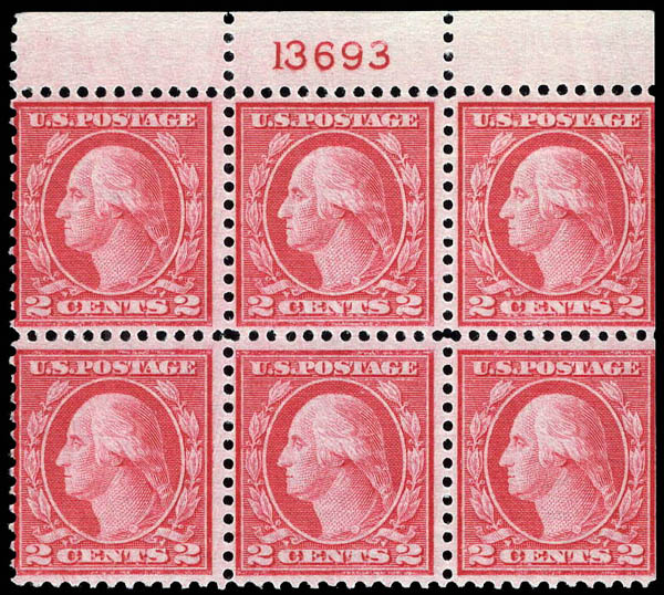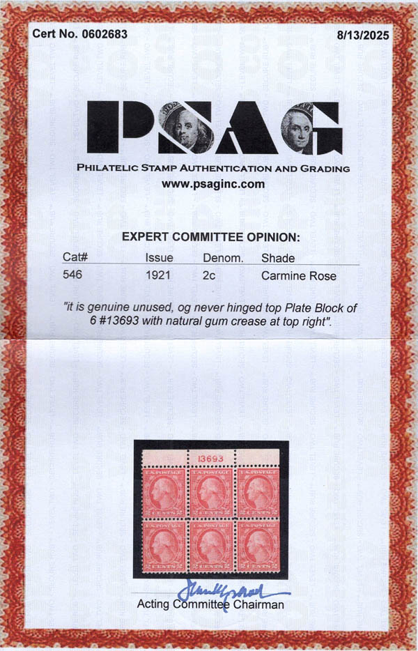 Lot 875![]() ![]() ![]() 1921, 2¢ Washington, type III, carmine rose, rotary press coil waste, perf. 11 (Scott 546), plate block of 6, o.g., never hinged; a natural gum crease at top right, otherwise Fine to Very Fine, with 2025 P.S.A.G. certificate. Scott $1,910. Estimate $400 - 600. |