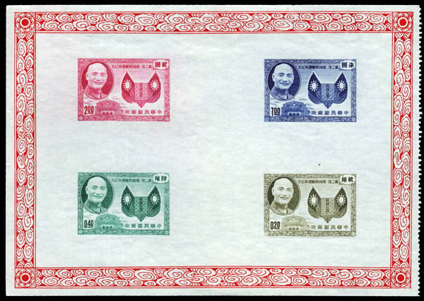 Lot 88 ( )China: Taiwan, 1955, Pres. Chiang Kai-shek 1st Anniversary of 2nd Re-election souvenir sheet (Scott 1114a), without gum as issued, without right selvedge, Fine to Very Fine. Scott $300. Estimate $75 - 100. |