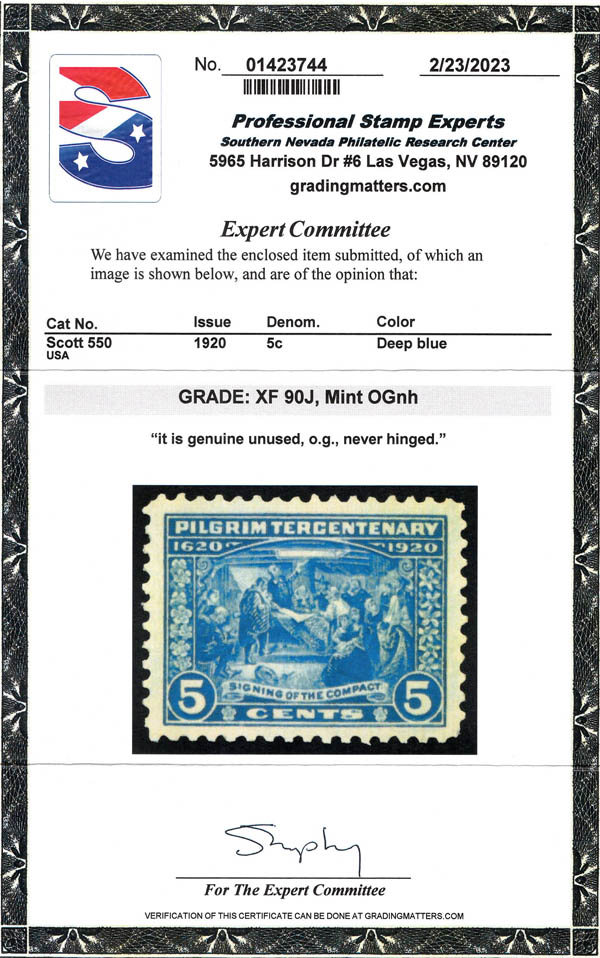 1920, 5¢ Pilgrim (Scott 550), o.g., never hinged, Extremely Fine, with 2023 P.S.E. certificate graded XF 90J. Scott $70. SMQ $325.