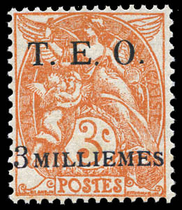 French Colonies: Syria, 1919, Type Blanc with "T.E.O." surcharge, 3m on 3c red orange (Scott 3), o.g., lightly hinged, Fine to Very Fine. Scott $300.