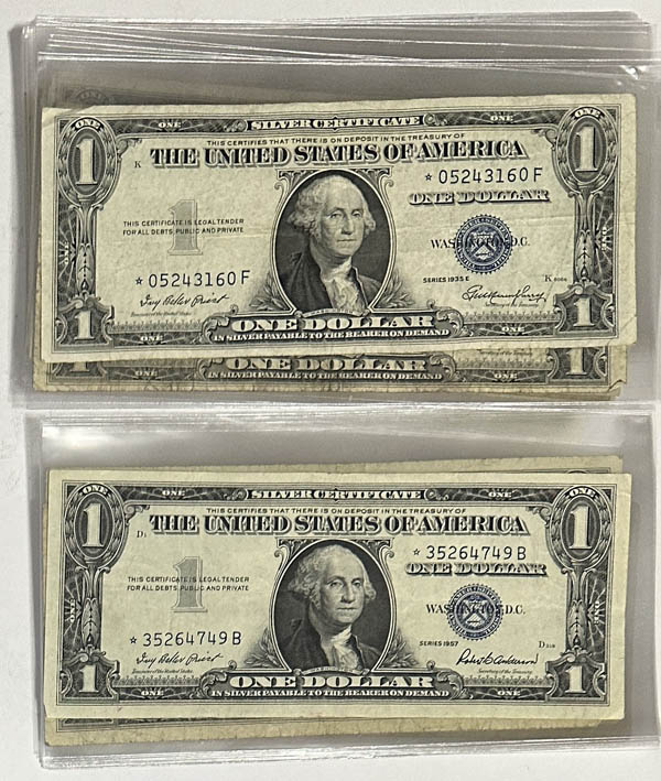 Silver Certificates, 1935 and 1957 Series, a group of 57, including 40 that are 1935 and 17 that are 1957. There are a few star notes too - one with a low serial number 05243160.