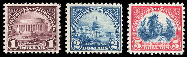 1923, $1 to $5 high values (Scott 571-573), set of 3, o.g., $1 and $5 are never hinged, the $2 is lightly hinged, Fine to Very Fine. Scott $300.