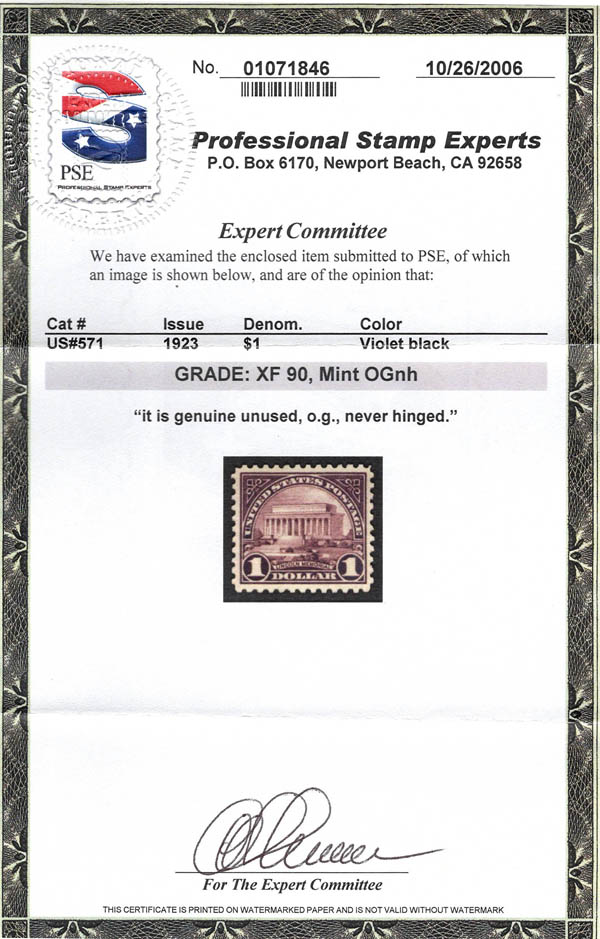 1923, $1 Lincoln Memorial (Scott 571), o.g., never hinged, Extremely Fine, with 2006 P.S.E. certificate graded XF 90. Scott $70. SMQ $125.