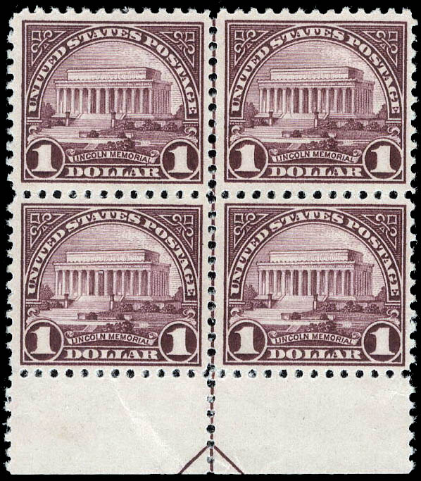 1923, $1 Lincoln Memorial (Scott 571), arrow block of 4, well centered, o.g., never hinged, Very Fine. Scott $300.