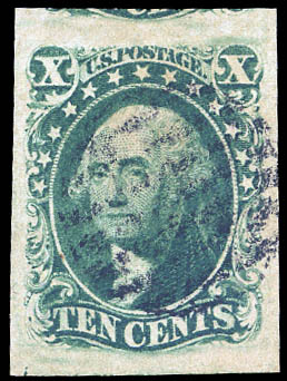 1855, 10¢ Washington, green, type III (Scott 15), huge jumbo margins including parts of the next stamp at top; tiny thin, otherwise Extremely Fine. Scott $145.
