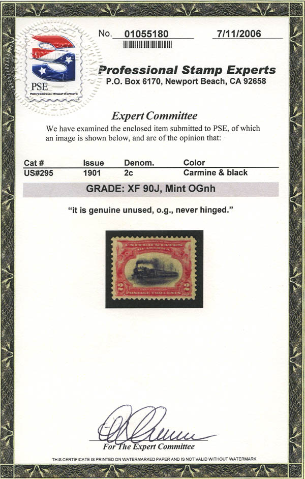 1901, 2¢ Pan-American (Scott 295), o.g., never hinged, Extremely Fine, with 2006 P.S.E. certificate graded XF 90J. Scott $40. SMQ $275.